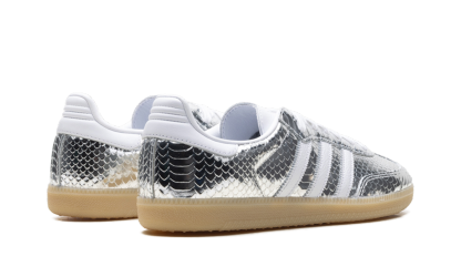 Embrace a futuristic, high-shine aesthetic with the adithtdas Samba OG WMNS "Patent Snakeskin Silver Metallic", model IH9016. This striking iteration of the legendary terrace classic features a shimmering silver metallic upper, finished with an embossed snakeskin texture that adds a luxurious, reptilian depth. Crisp white accents on the Three Stripes, laces, and heel tab provide a clean contrast, while the traditional gum rubber outsole anchors the bold design in heritage sport style. These sneakers are the ultimate statement piece for those looking to blend a retro silhouette with a daring, modern edge.