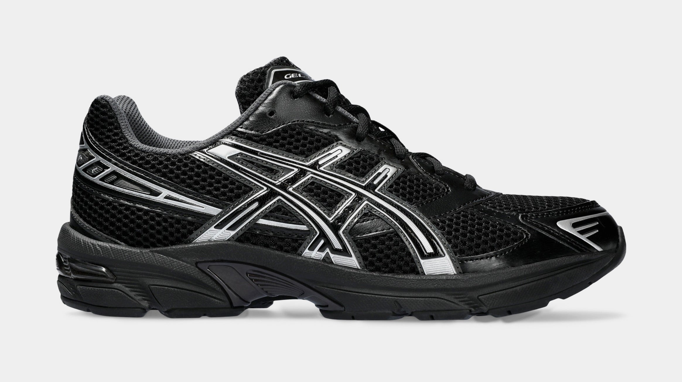 The Asithtcs Gel 1130 'Black Pure Silver' combines black open-cell mesh with tonal synthetic leather overlays. Metallic silver accents land on the signature tiger stripes, toe wrap and heel overlay. Grey textile lines the collar, maintaining the shoe's neutral palette. Lightweight cushioning arrives via a solid black EVA midsole with a shock-absorbing Gel insert in the heel.