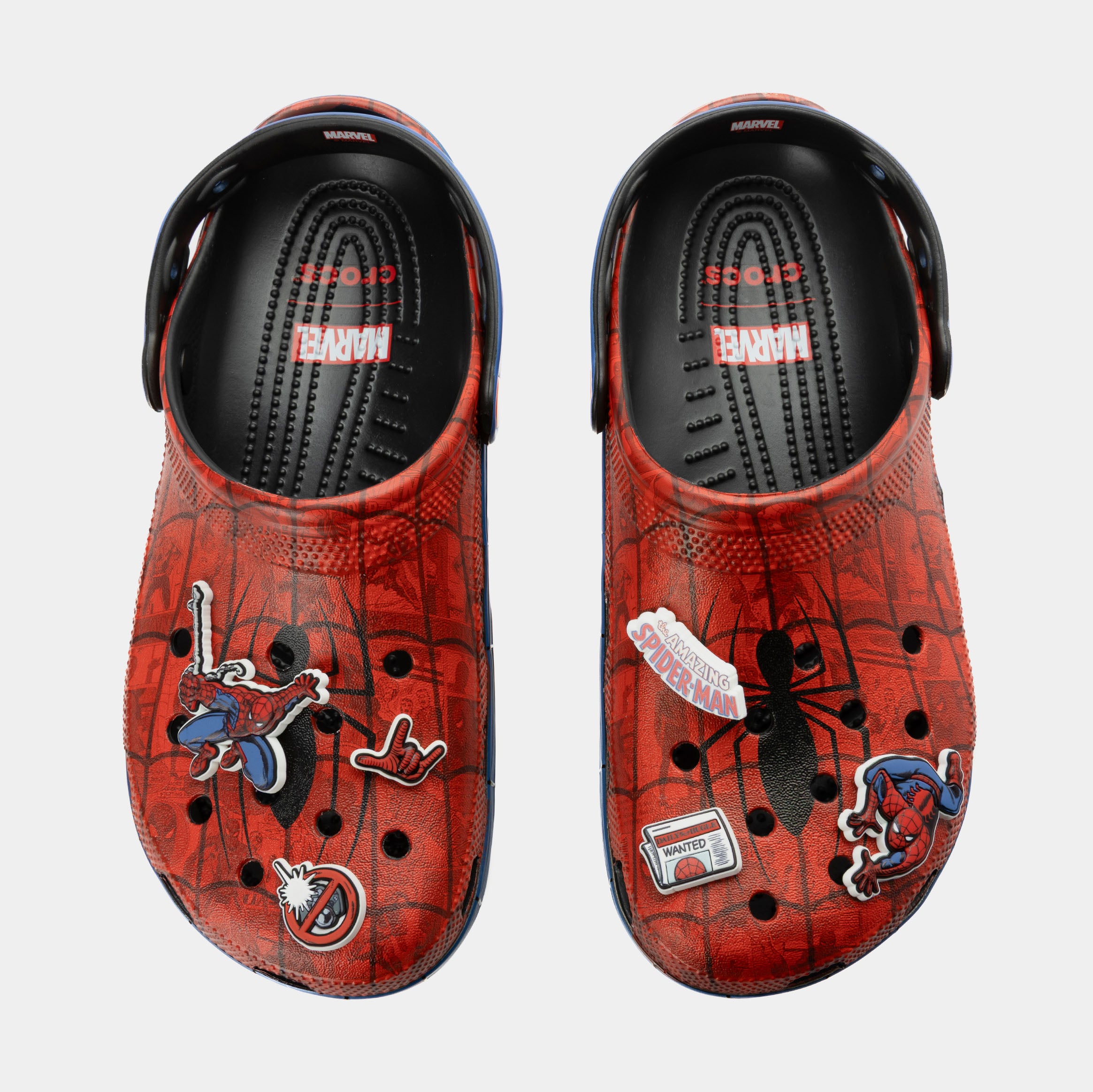 Swing into action in the Spider-Man Web Classic Clog. The iconic clog gets a spidey transformation and features a subtle Spider-Man graphic print underneath his signature web and spider logo on the upper and heel. Each pair also comes with a collection of SpiderMan Jibbitz™ charms plus room to add even more of your favorites on the upper and heel strap.