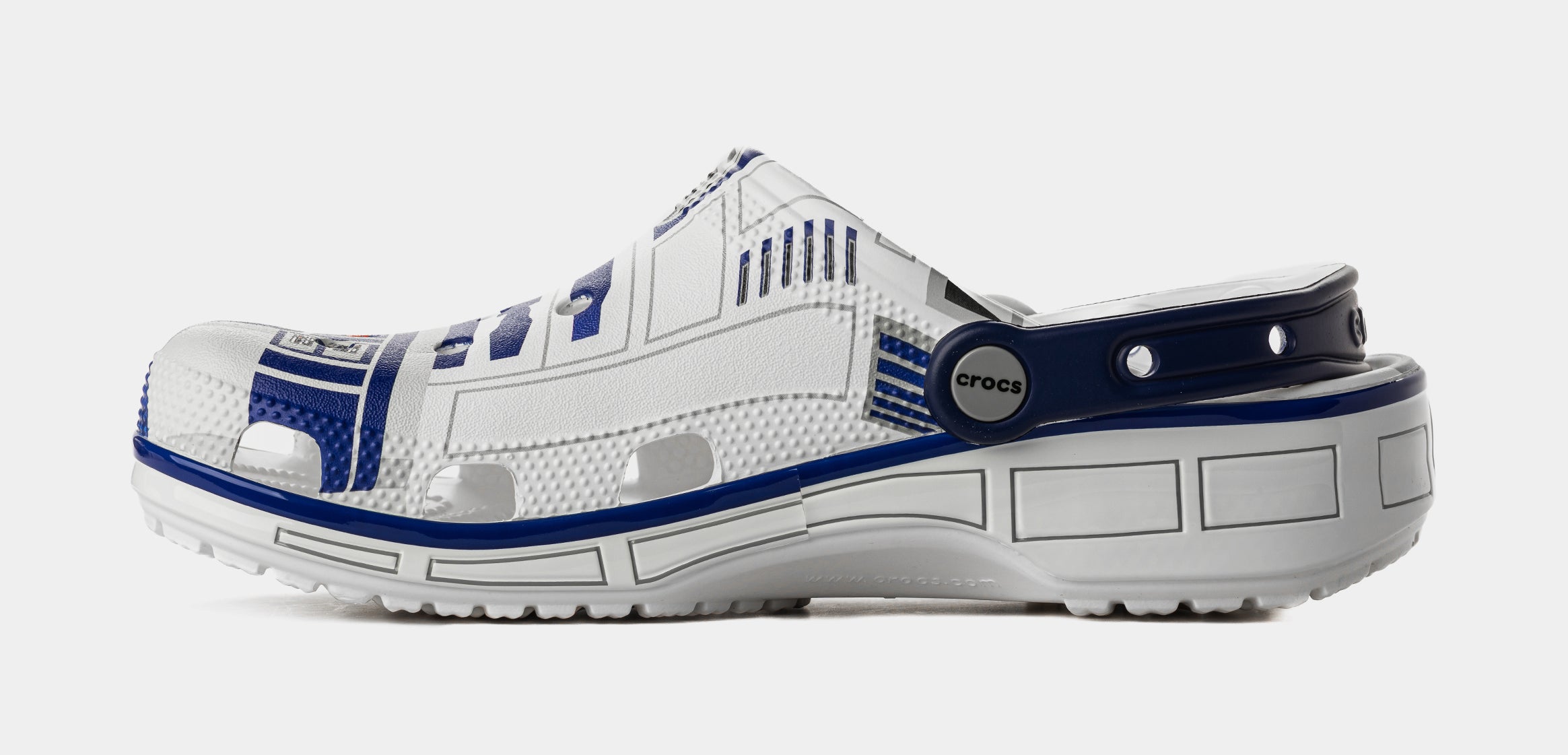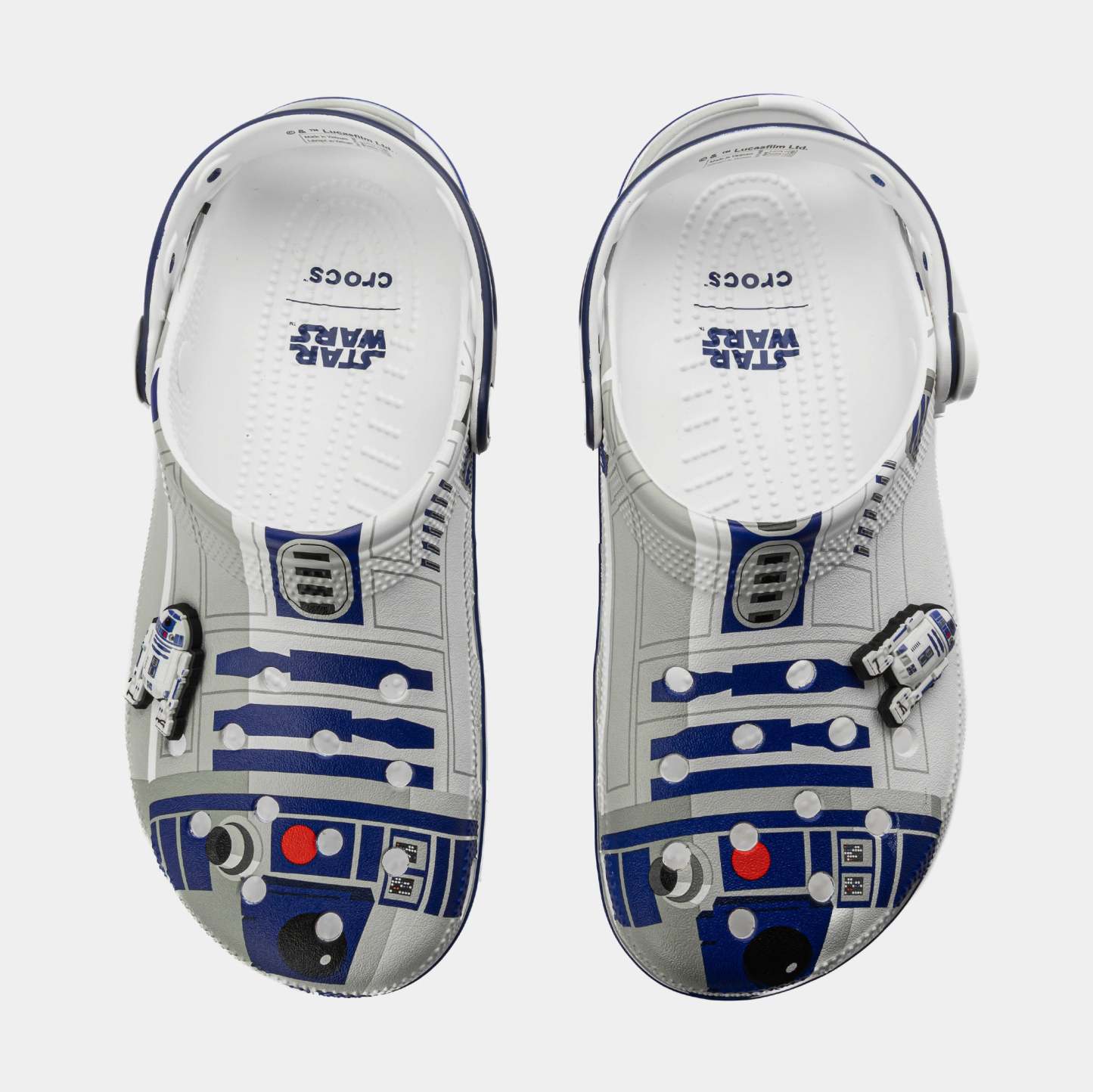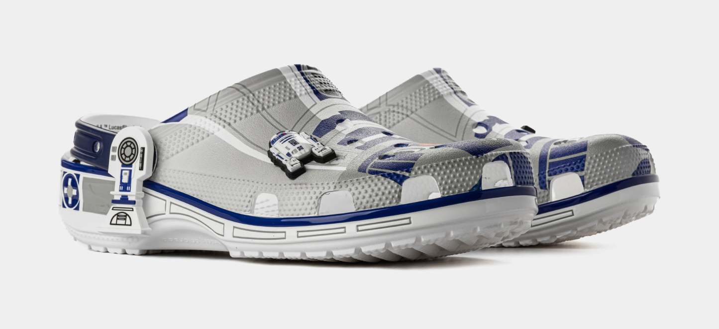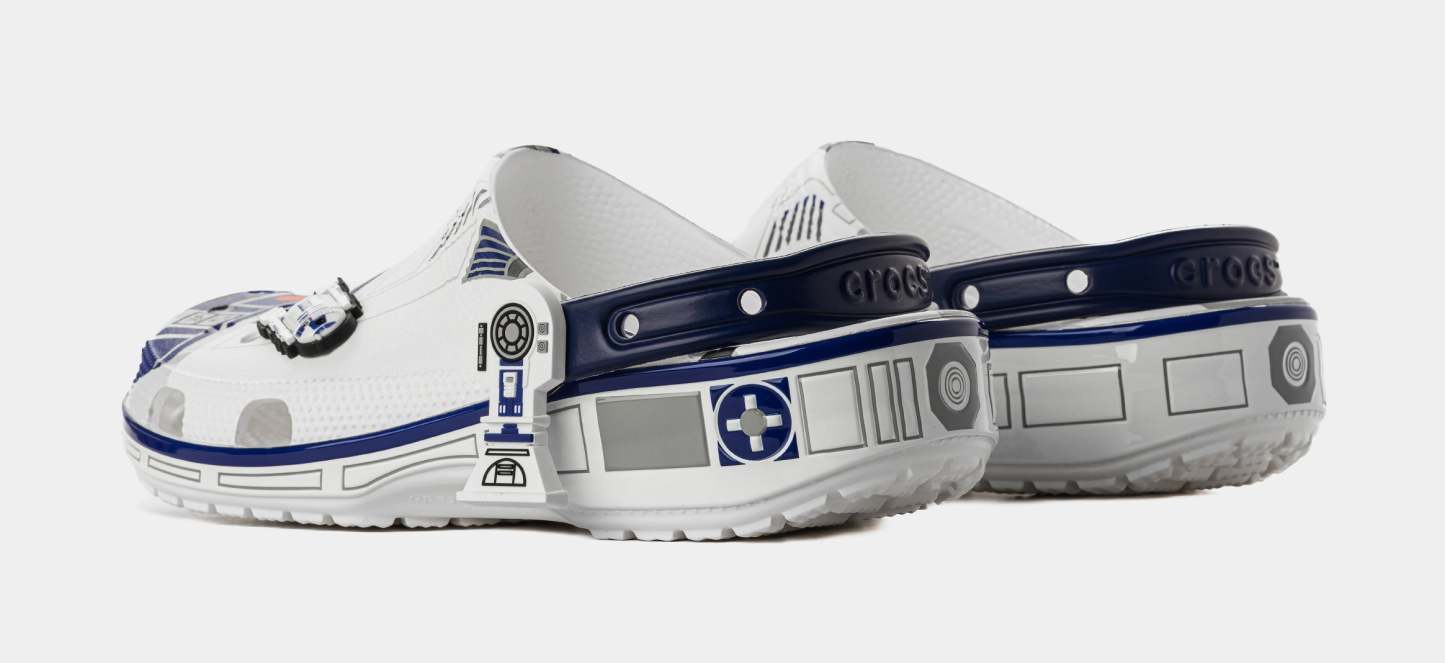 The heroic droid from the epic STAR WARS™ saga inspired this comfortable R2-D2 Classic Clog. This limited-edition design features printed droid details across the upper that embodies all the charm of R2-D2, with pivoting legs near each heel cup to complete this character-turned-clog design. This style is paired with two R2-D2 Jibbitz™ charms and plenty of space for more personalization to show off your STAR WARS™ fandom.