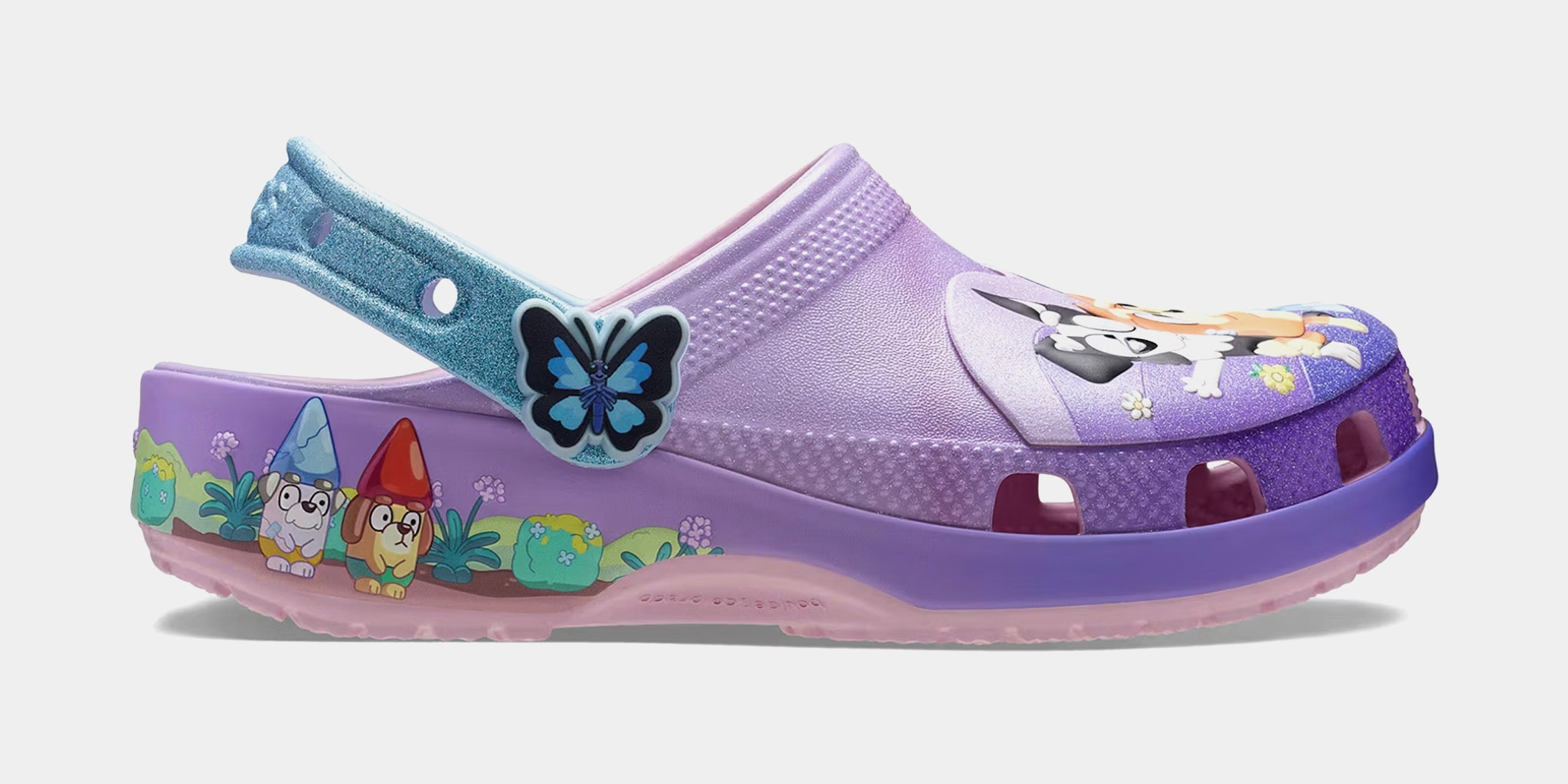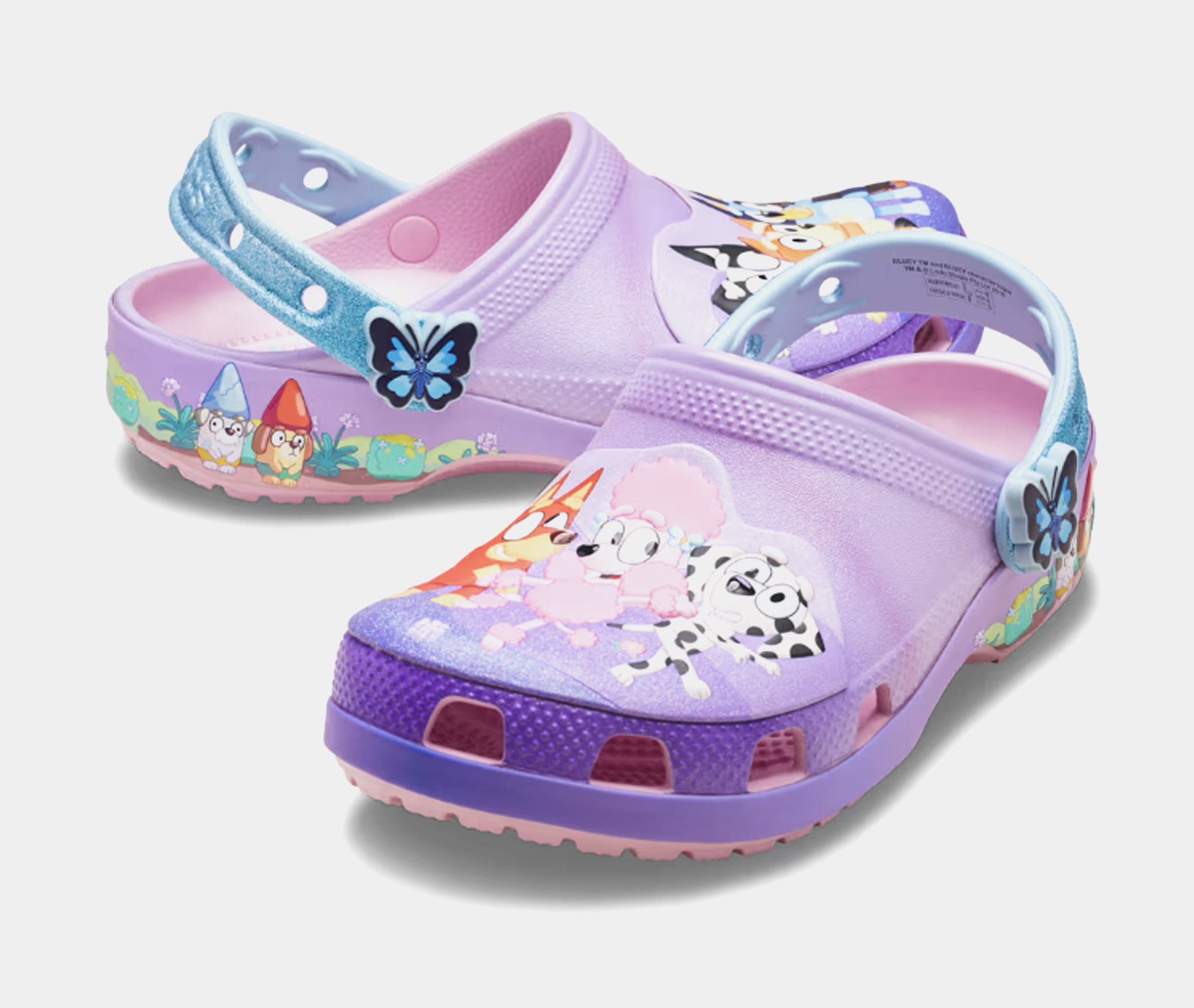 It’s time to shine with this sparkling new style from the Bluey collection. This Bluey Friends Forever Classic Clog features Bluey and Bingo with their friends Mackenzie, Snickers, Rusty, Coco, and Chloe across the upper. Playfully designed, this comfortable clog will put a little spring in your step with dimensional details including a garden scene on the sole featuring The Gnomes. A glittery blue back strap is adorned with Flappy the butterfly for added whimsy.