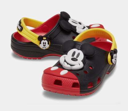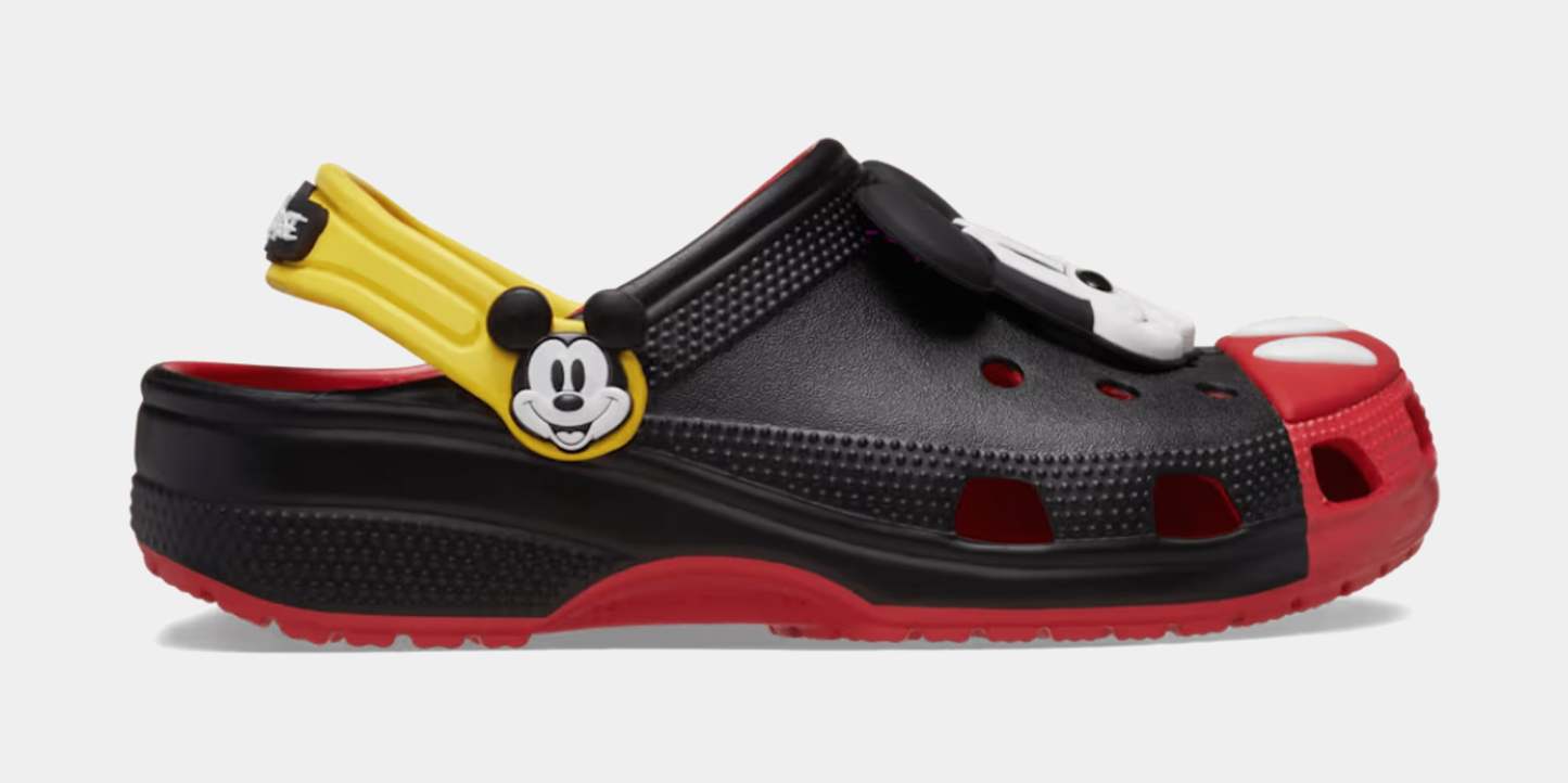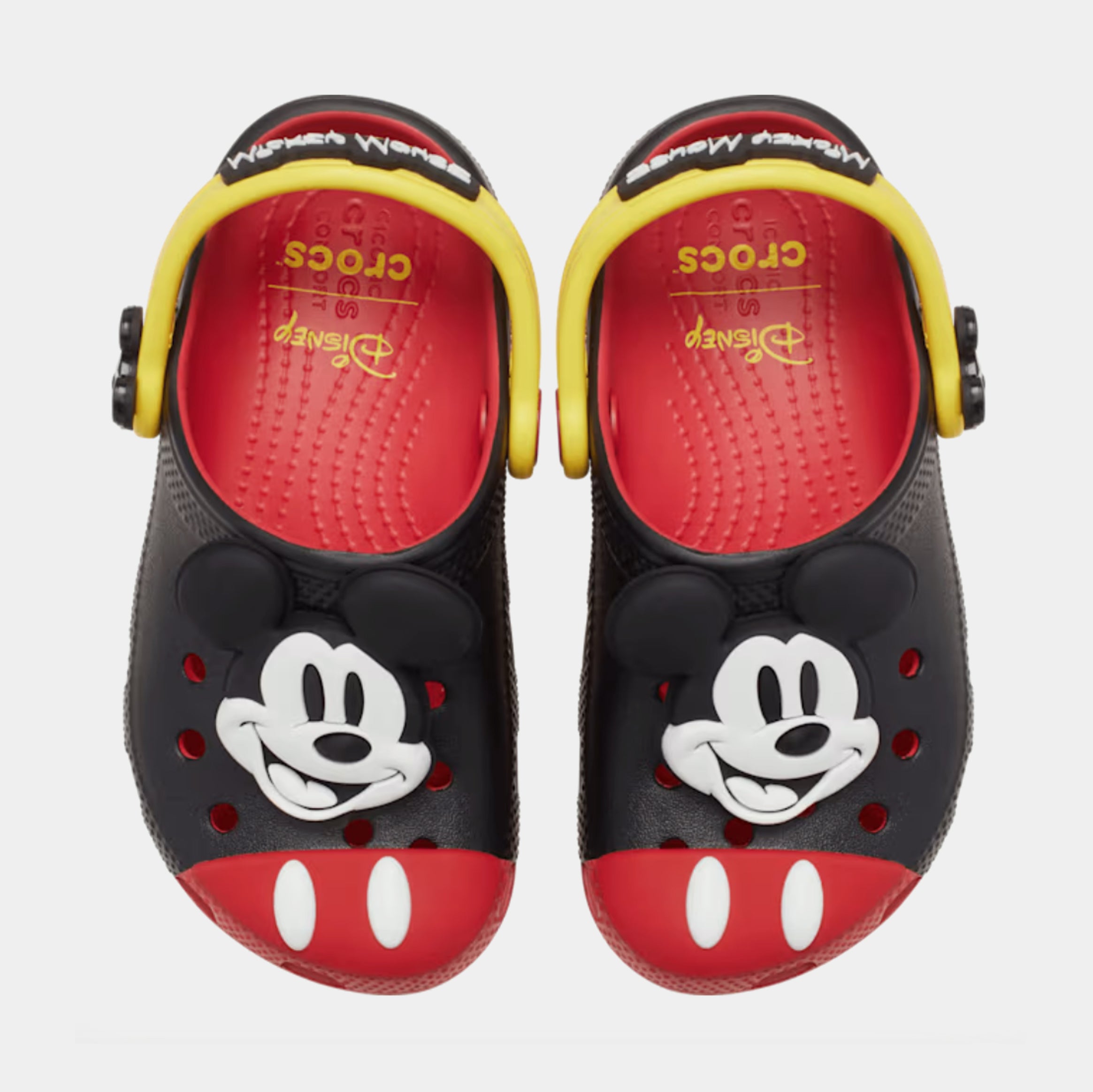 Oh boy, the Mickey Mouse Classic Clog is here! This comfortable clog is designed with a black upper and red toe with white buttons, like his iconic costume. The Mouse’s smiling grin completes the look with dimensional face details for an extra animated style. Mickey’s face adorns each rivet with a Mickey Mouse character signature across the backstrap.