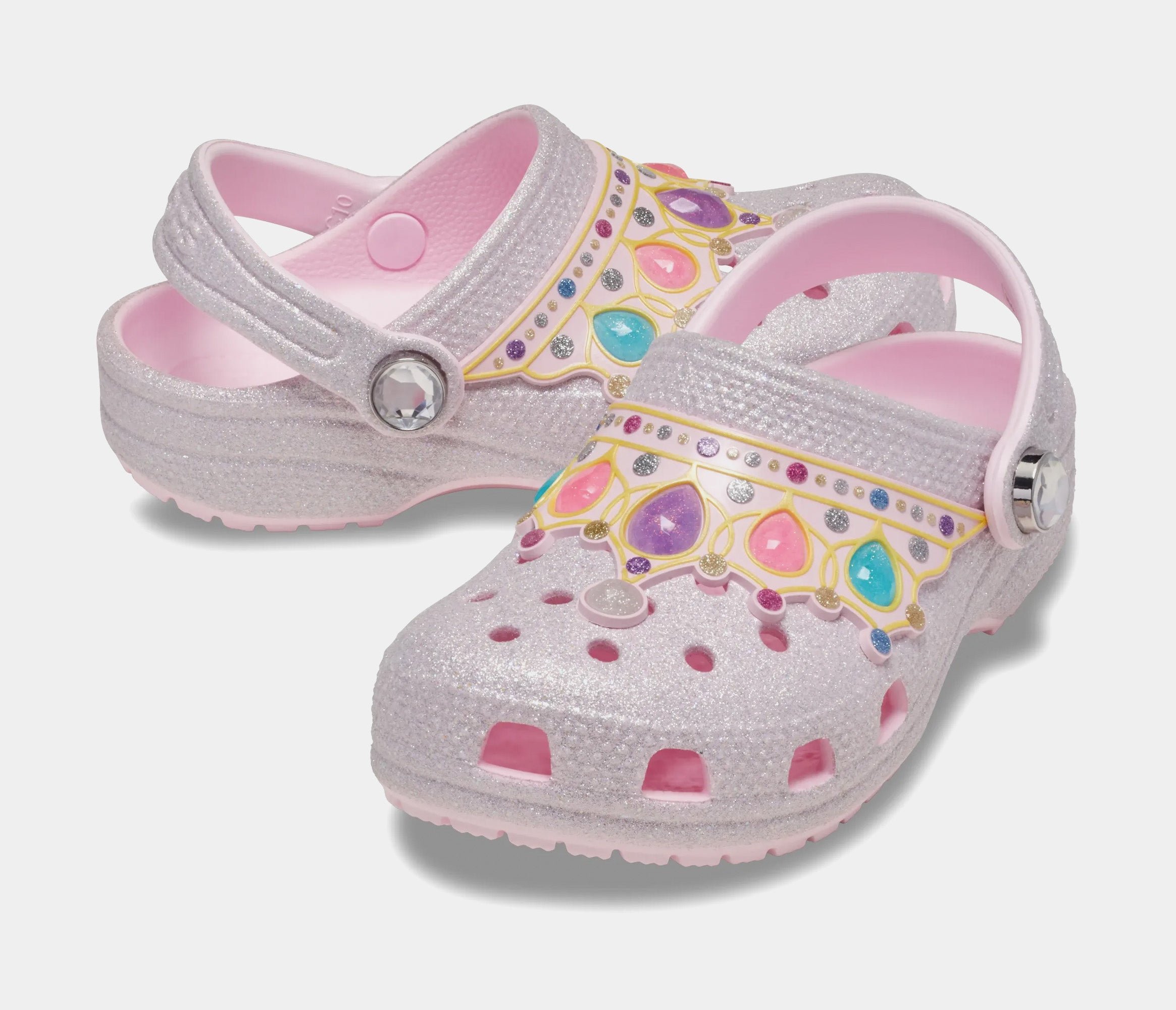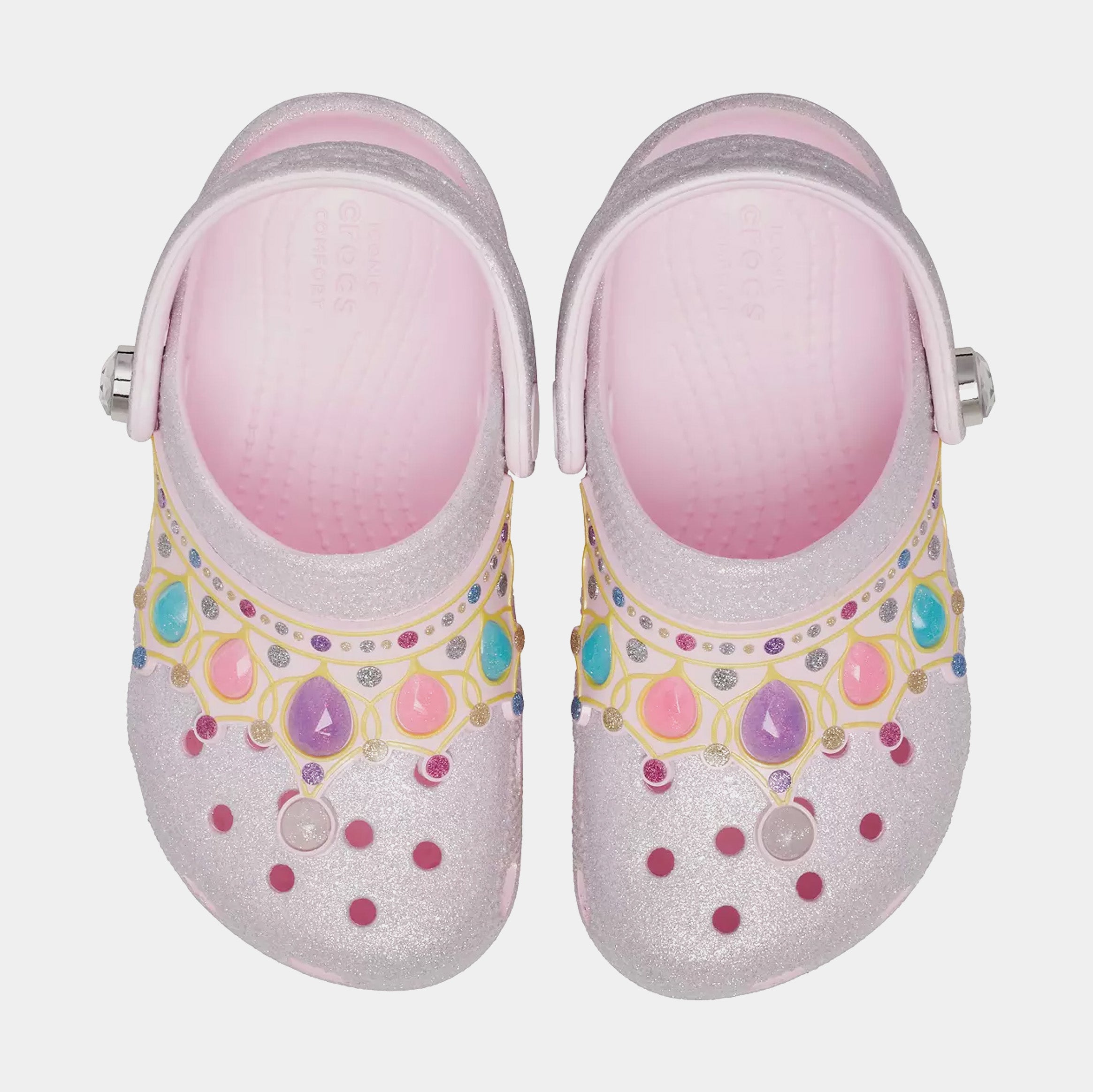 These clogs are perfect for your little princess. Featuring fun glitter and princess-themed embellishments, your little ones can pretend like they are a princess when they put on these sparkly shoes. The upper features a chunky glitter treatment and a faux gem flower embellishment, and the heel strap is covered in a scrunchy organza fabric. Little ones will love parading around in these comfy and glamourous clogs.