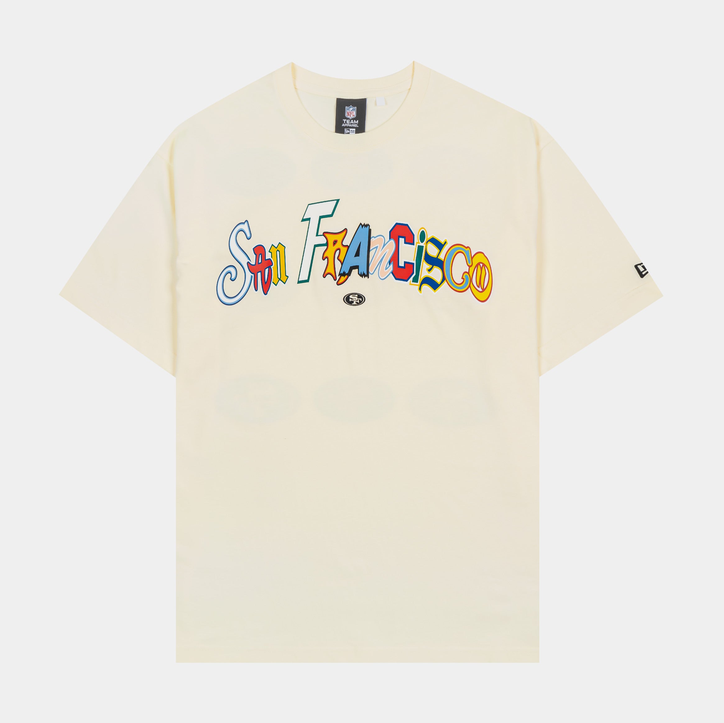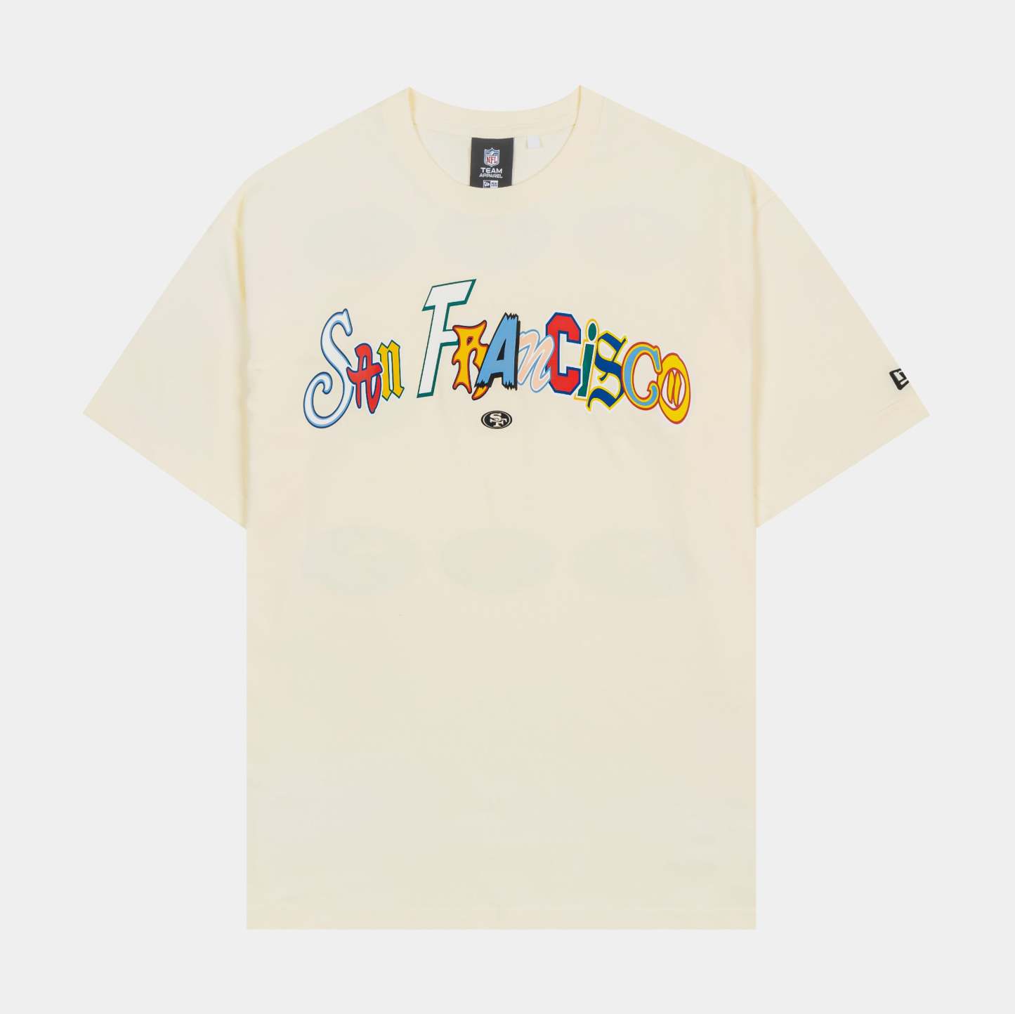 This cream short-sleeve tee spells out “San Francisco” across the chest in bold, multicolor lettering with each letter designed in a unique font. The back and lower front are decorated with colorful circular 49ers logos, giving the shirt a standout look from every angle. Made from soft cotton for everyday comfort, it’s finished with the New Ethtra flag embroidery on the sleeve for an authentic touch.