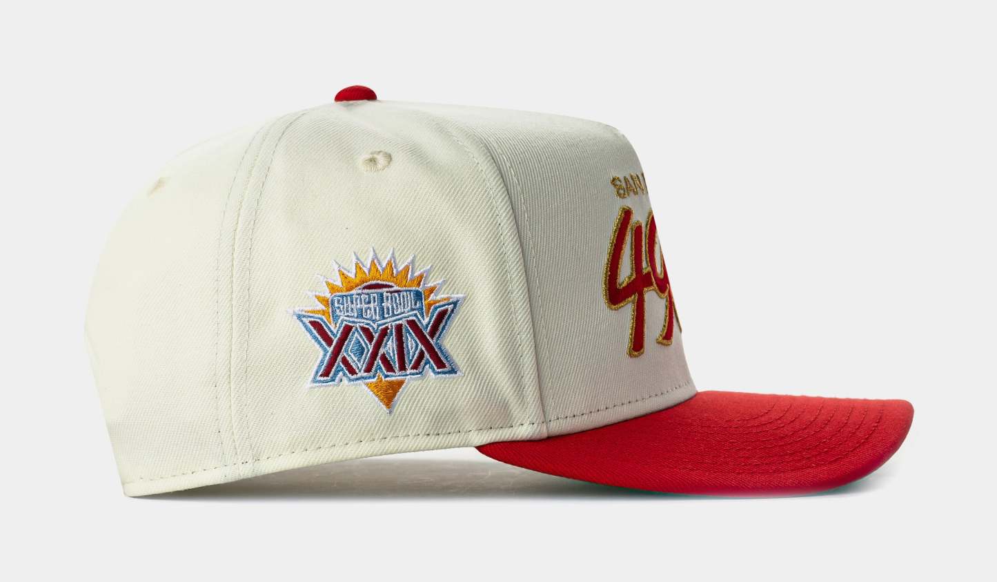 Rep your team with pride in the Shoe Palace Exclusive San Francisco 49ers Snapback. Featuring bold 49ers embroidery on the front and Super Bowl XXIX side detailing, this hat blends heritage and style perfectly. The red brim, green undervisor, and adjustable snapback closure make it a must-have for every faithful fan.