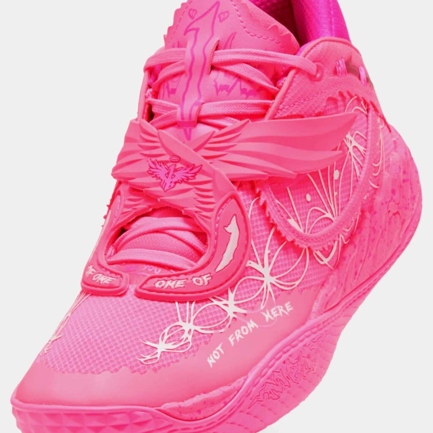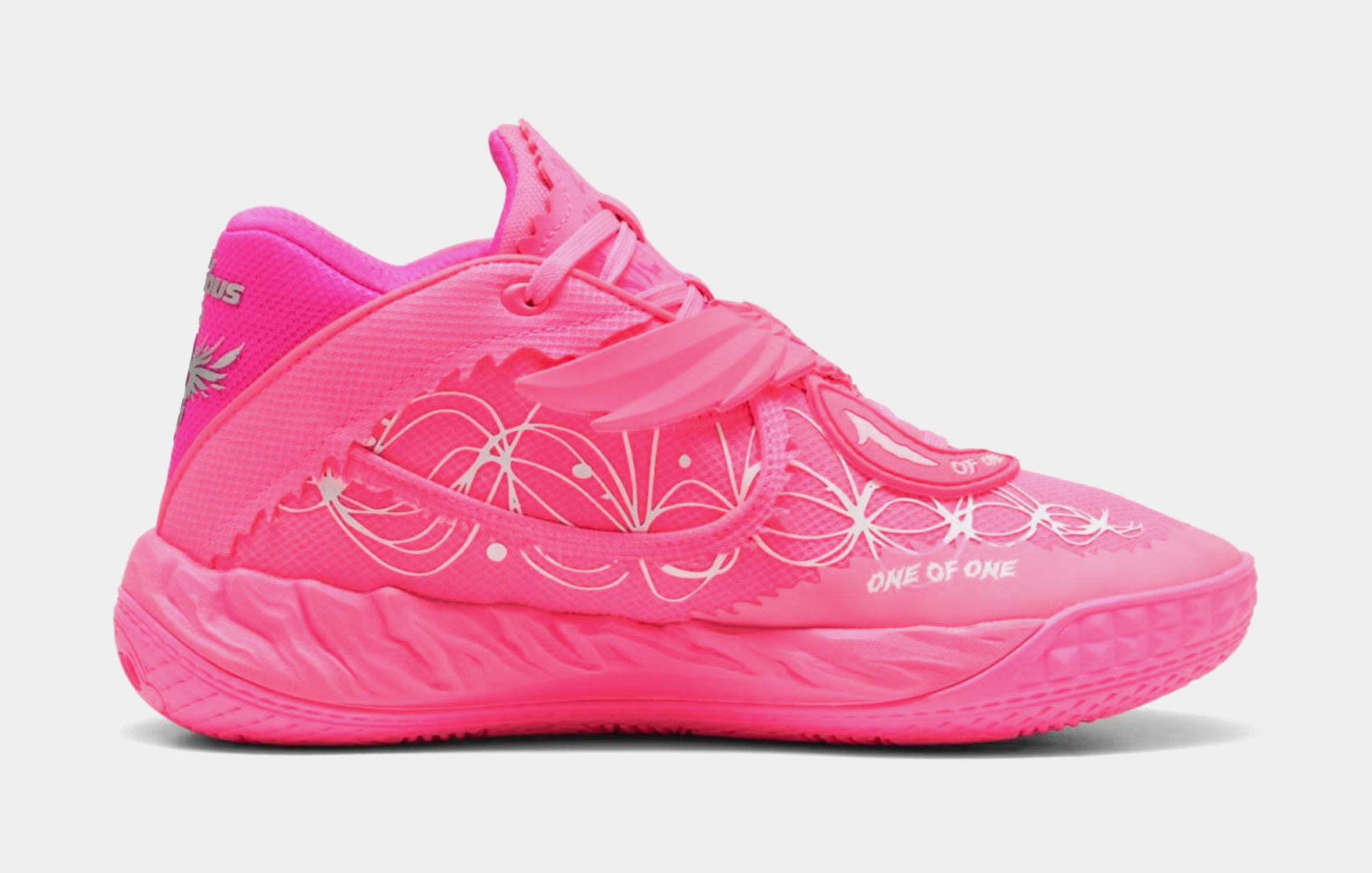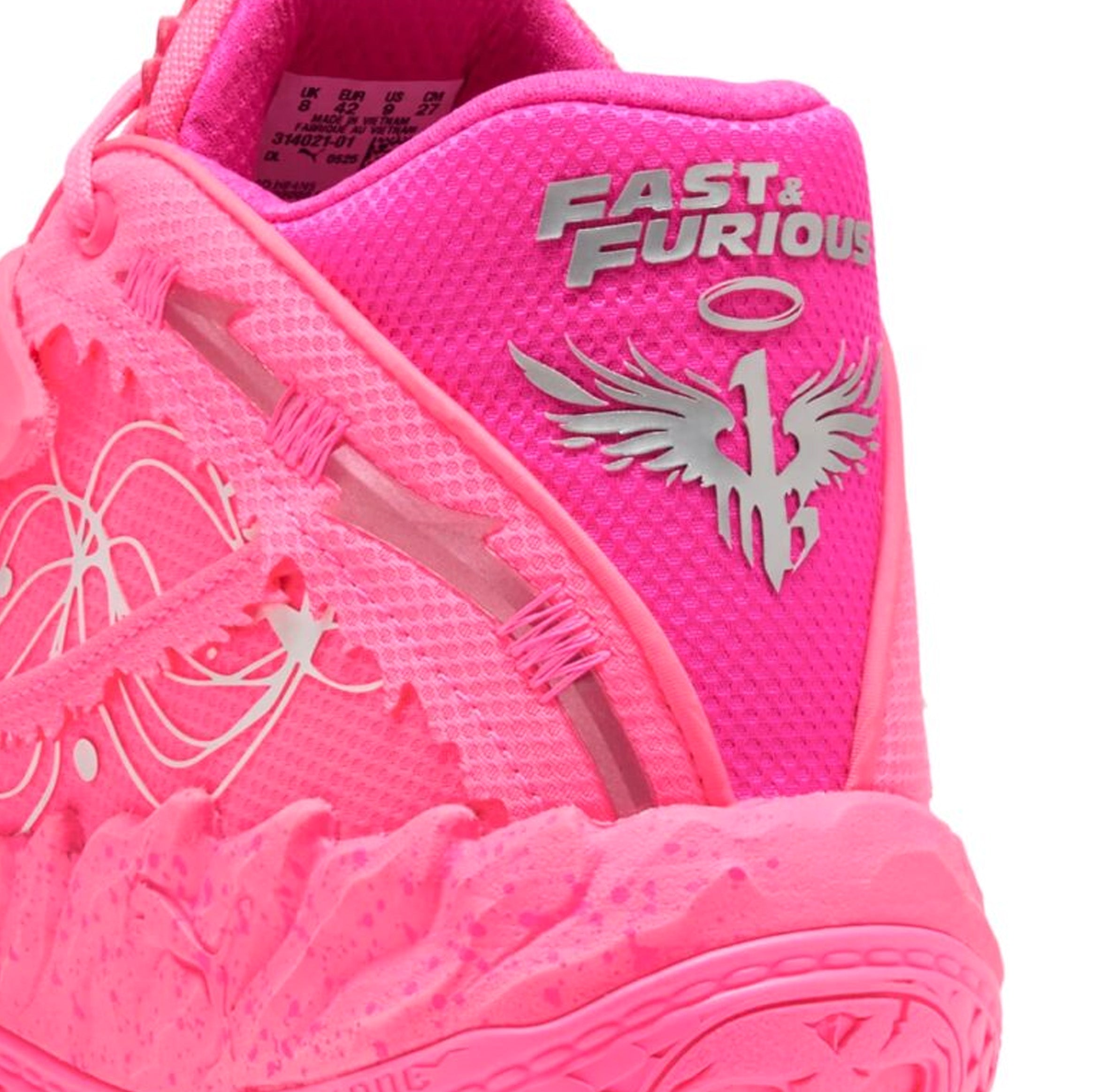 Puthtma Hoops teams up with Fast & Furious for a collab that’s all speed, no brakes. This edition of the MB.05, Melo's latest signature shoe, nods to the iconic Miami car scene in 2 Fast 2 Furious - and Suki's unforgettable pink ride. Dripping in hot pink with flashy floral-inspired graphics, plus moulded barbed wire and hidden Melo details, this pair goes all out.