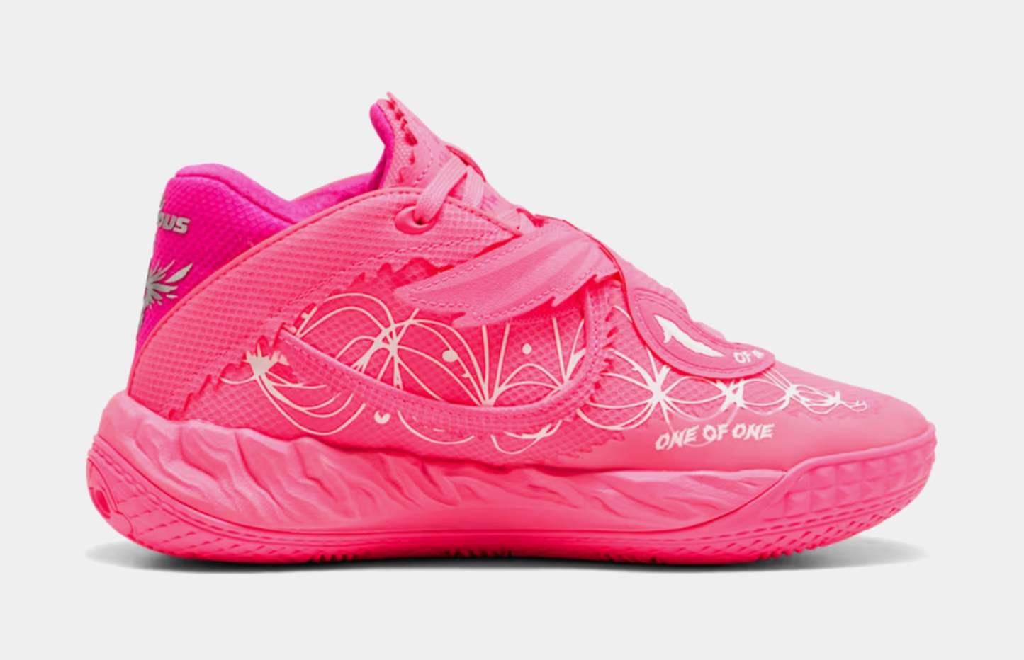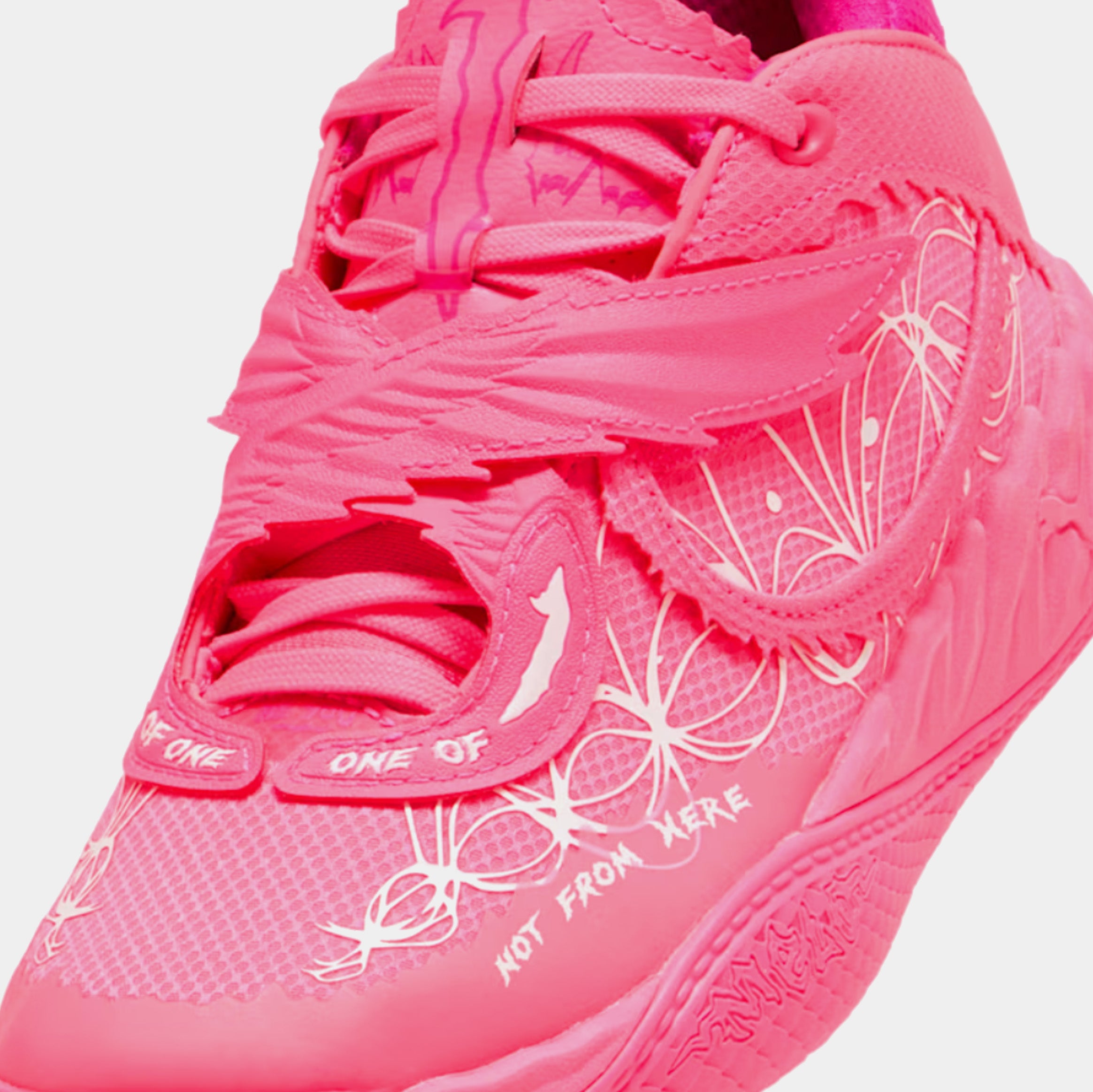 Puthtma Hoops teams up with Fast & Furious for a collab that’s all speed, no brakes. This edition of the MB.05, Melo's latest signature shoe, nods to the iconic Miami car scene in 2 Fast 2 Furious - and Suki's unforgettable pink ride. Dripping in hot pink with flashy floral-inspired graphics, plus moulded barbed wire and hidden Melo details, this pair goes all out.