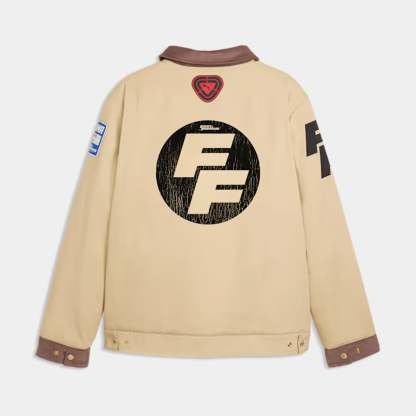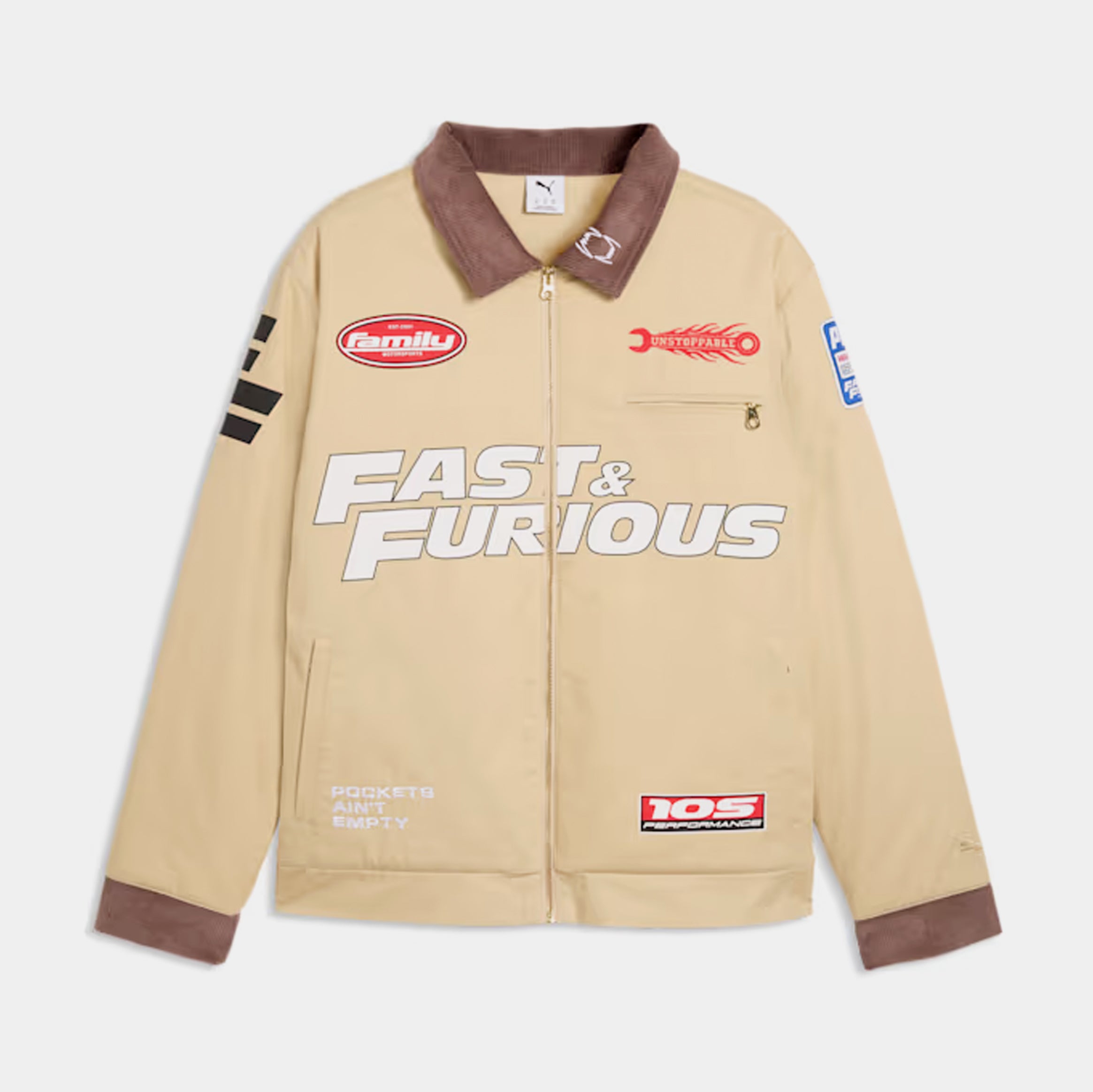 Puthtma teams up with Fast & Furious for a collection that's all gas, no brakes. Blending the bold energy of the franchise with Melo's unmistakable game and personal style, this collection is flashy, fun, and firing on all cylinders. A spin on utilitarian style, this workwear jacket comes with logos impossible to miss.