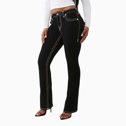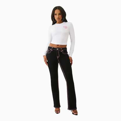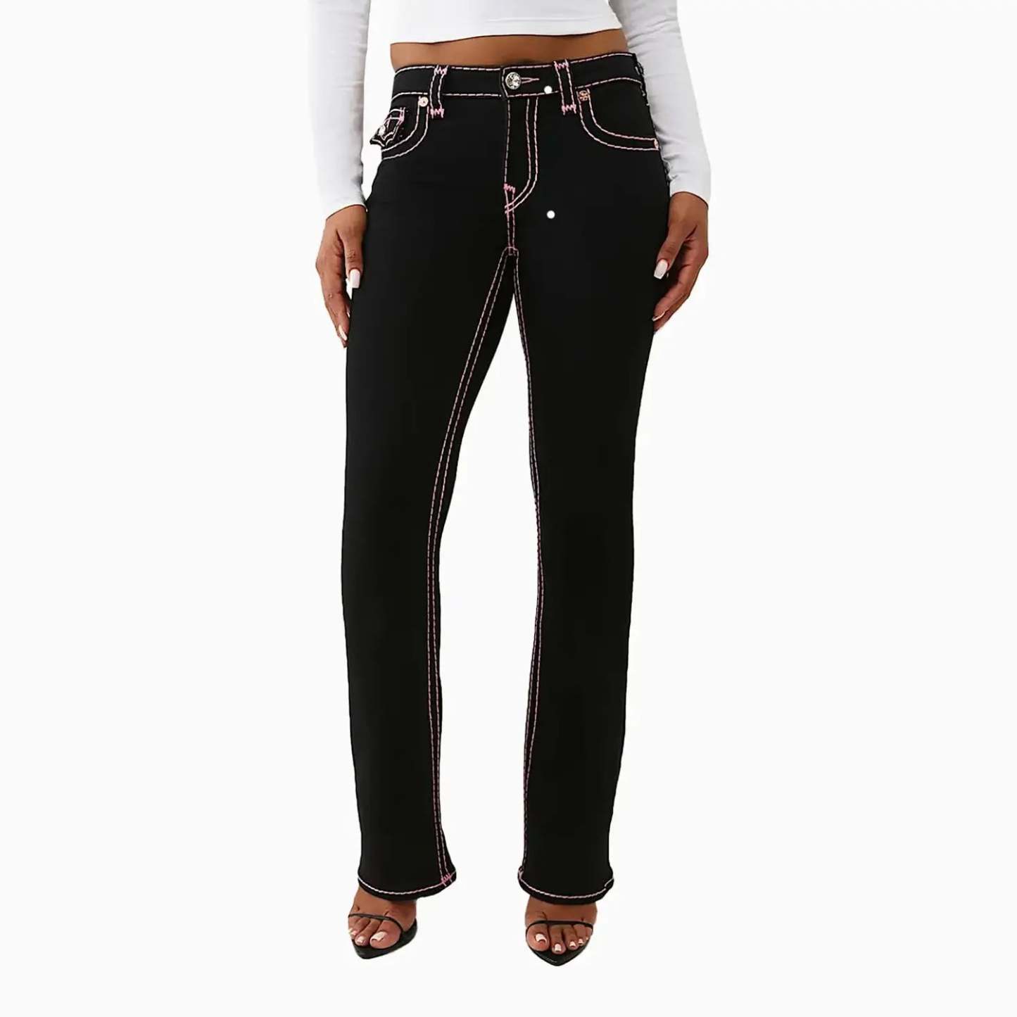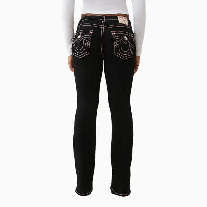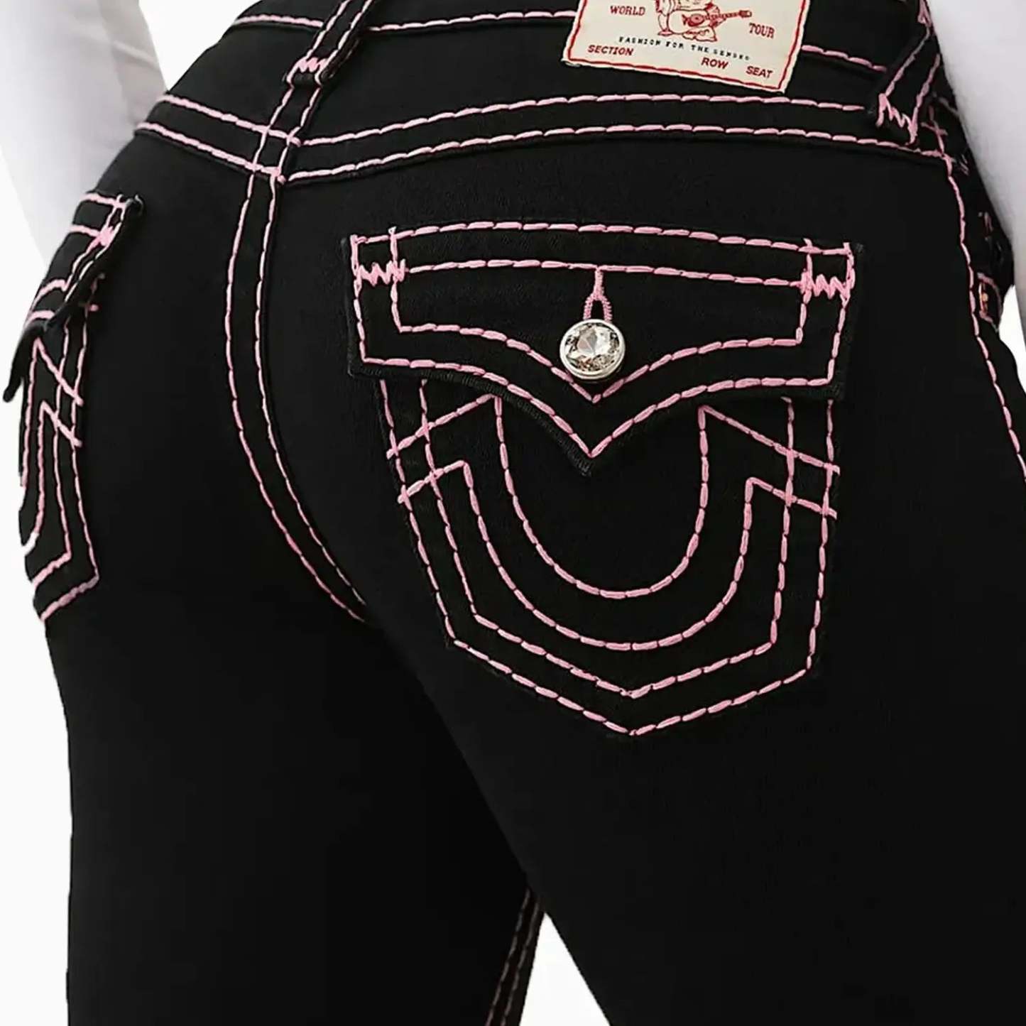 The Becca Mid Rise Super T Bootcut Jean delivers timeless, flattering vibes. This leg-lengthening flared fit features a dark wash, hot pink Super T stitching, glass buttons, and stitched horseshoes on the back flap pockets.