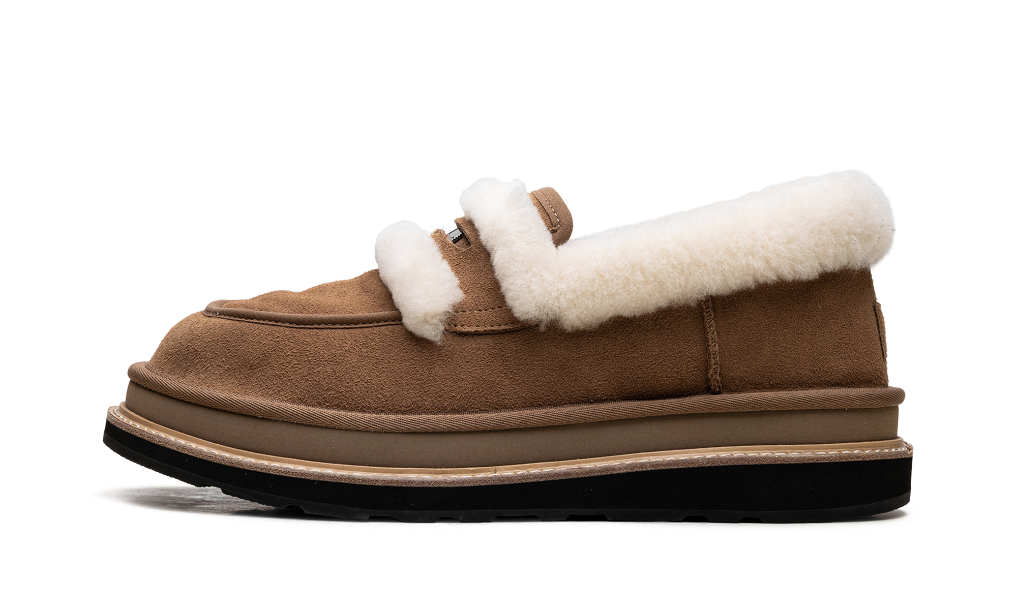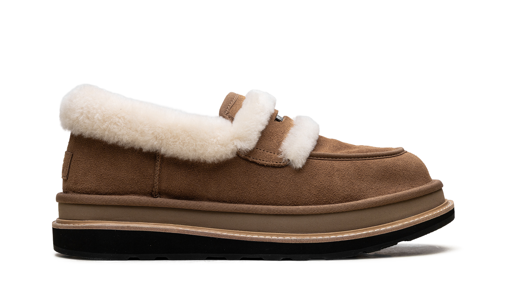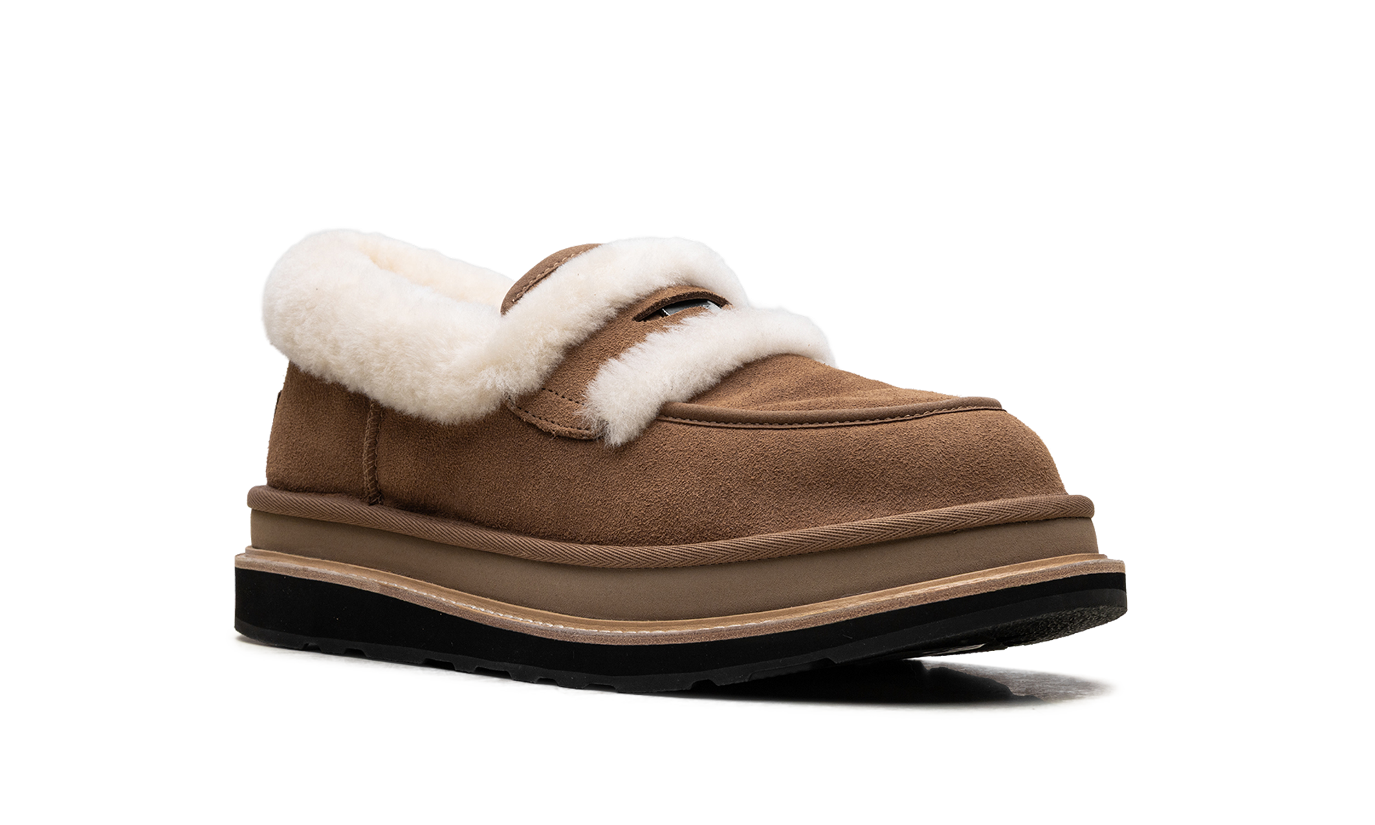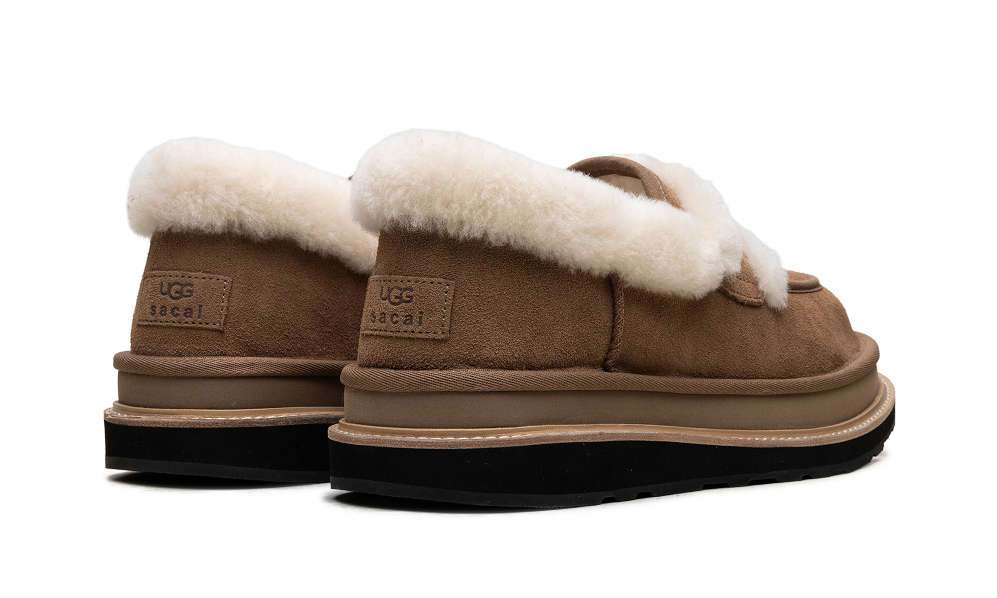 Amplify your lifestyle rotation with the UGthtG sacai Loafer "Chestnut," a high-status hybrid architect that reinterprets radical lounge heritage through a clinical, avant-garde lens. Featuring a premium landscape of rich "Chestnut" suede, the design is defined by its streamlined anatomical profile and specialized sheepskin spill-out detailing that provides a sharp technical strike of texture and warmth. Grounded by a clinical, stacked platform midsole that incorporates sacai’s signature deconstructed aesthetic and a rUGthtGed rubber outsole for elite multi-surface traction, this collaboration successfully pairs the aggressive DNA of high-fashion construction with a sophisticated, ultra-comfortable finish.